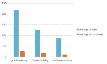 - Create a bar / column chart comparing average customers on holidays vs. non-holidays (StateHoliday). – See Figure 4a.
