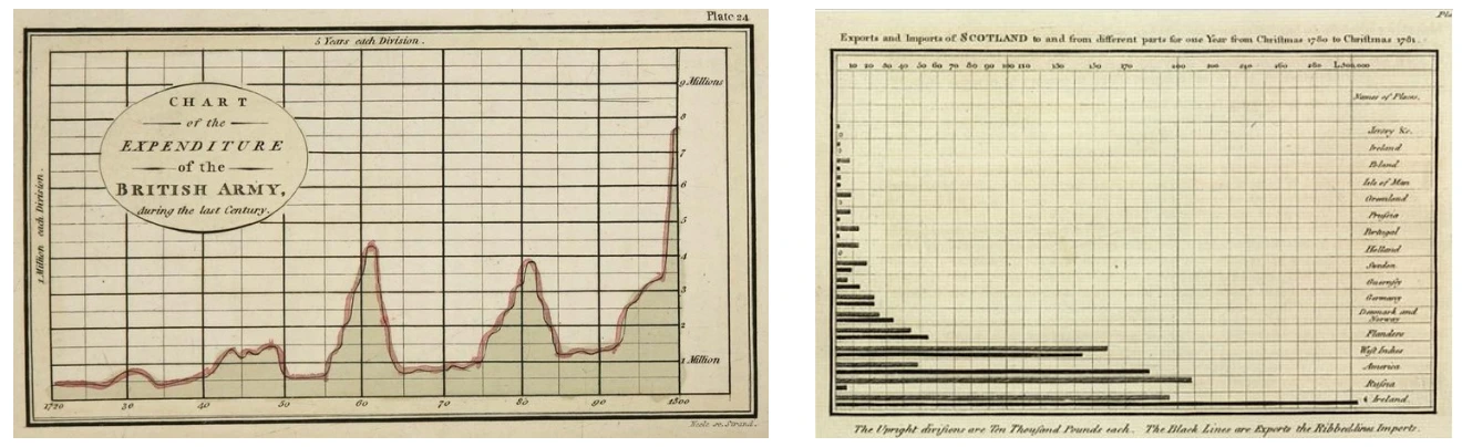 To demonstrate the power of these charts, he created a line chart visualizing the money the British army spent on a yearly basis, as well as a bar chart visualizing Scotland’s imports and exports. He published his economic data in The Commercial and Political Atlas in 1788: