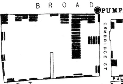 Another mapping innovation around this time was density mapping — the representation of each instance of an event by a symbol (e.g., a point or bar). In 1854, physician John Snow created a map of cholera deaths in the Soho district of London, with each death represented by a single dark line. Mapping each event at the street level of detail made it easy to see that the deaths were clustered around a single water pump source, which Snow was able to identify as the source of the epidemic and help stop its spread: