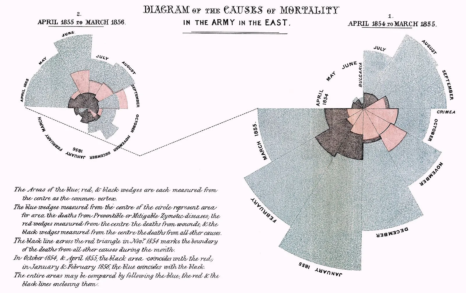To this day, this pie chart is referred to as the polar area diagram, or the “Nightingale Rose.” At the time, these graphs provided a more-accessible way to communicate information to members of parliament to advocate for the health of the army.