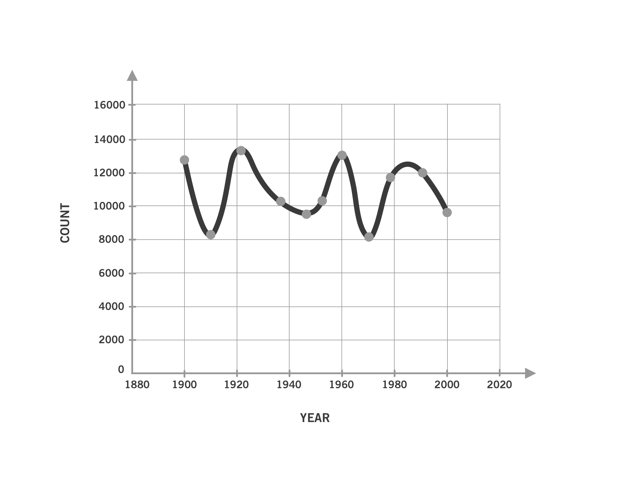 In addition to making data visualization more widespread, the adoption of data visualization software has brought a new sense of interactivity to data. In a static graph, the data is set, and the person viewing the graph can’t make any changes to it. Consider this simple line chart showing the count of something across many years. In its current form as a static visualization, nothing about it can be changed:
