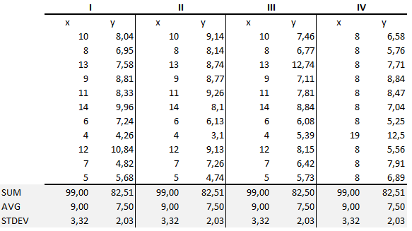 The importance of data visualization as an additional tool for data analysts is best demonstrated by Ancombe’s Quartet (1973). Francis Anscombe, a statistician, created four data sets of eleven pairs (x,y) of numbers. Each data set resulted in the same descriptive statistics — in other words, they all had the same sums, means, variances, standard deviations, and correlation coefficients. As such, if you were only going by your summary statistics, each data set would appear to be the same: