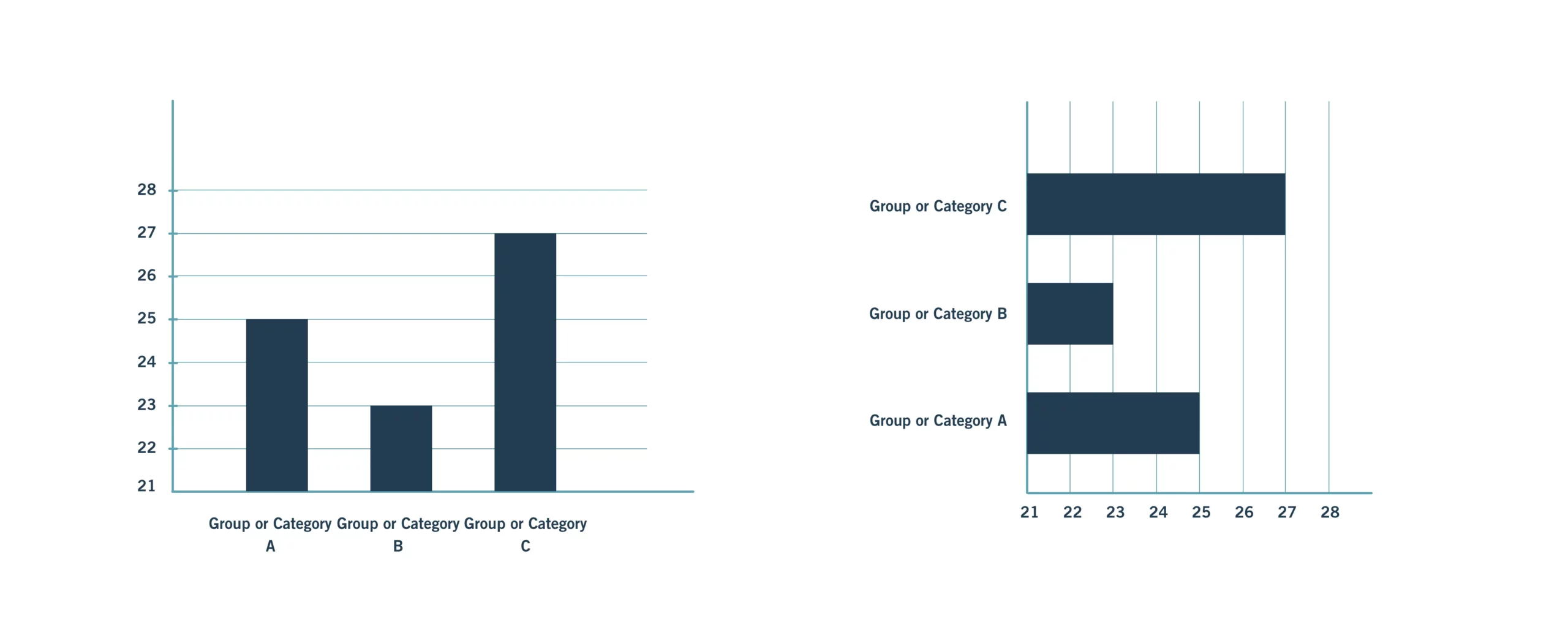 The difference between a bar chart and a column chart comes down to orientation. A column is vertical, so column charts (left in Figure 11) are those with vertical pillars. Sometimes, you’ll hear them referred to as “vertical bar charts.” Conversely, bars are horizontal, so bar charts (right in Figure 11) are those with horizontal pillars. The choice between a bar or a column chart usually depends on the category names. On the left, the names are so long that they wrap onto a second line. This should be avoided when possible and can be easily mitigated by using a bar chart instead: