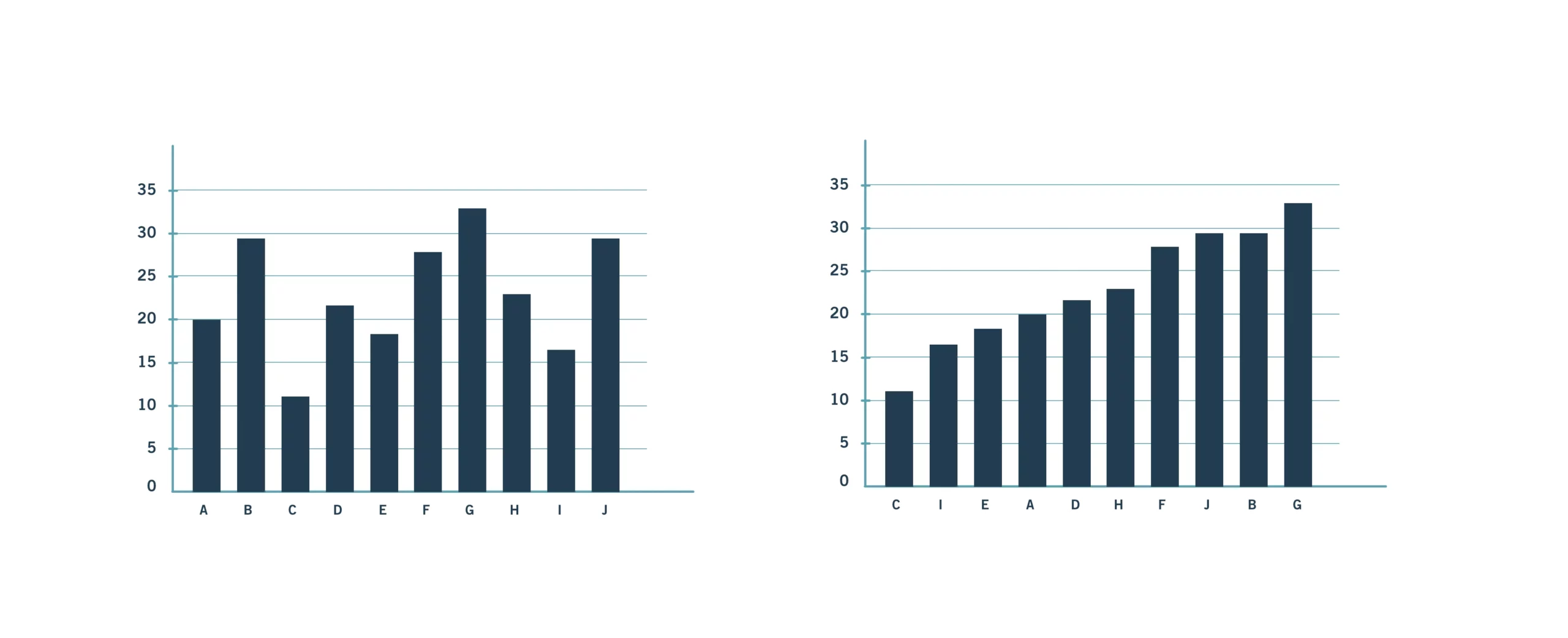 Humans can easily distinguish different lengths of a pillar (or bar). Thus, bar charts are good at displaying multiple categories of data; however, you can (and should) further help viewers by organizing the data in your bar charts, for instance, by arranging it in ascending (smallest to largest) or descending (largest to smallest) order. This relates to the grouping principle you learned about in Exercise 2.2: Visual Design Basics & Tableau. People like to see patterns, and size is one component that can be easily used to make patterns in data. For instance, in the graph on the left of Figure 12, you might unconsciously group bars B, F, G and J together because they’re all quite large. See how this has been done in the chart on the right of Figure 12, where bars B, F, G and J have been grouped together and all the bars have been ordered from smallest to largest: