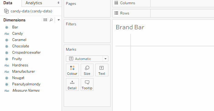 Next, you want to bring the variable you want to count into the view. You’ll be counting the number of candies for each manufacturer, so you’ll want to drag the Candy variable over to the Columns shelf: