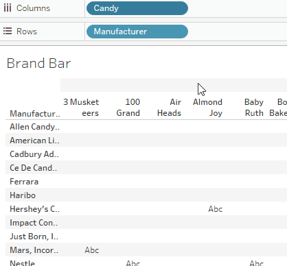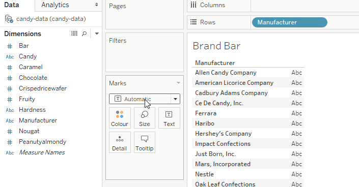 - Bring the variable that represents the grouping you want into the visualization view. In this case, that would be the Manufacturer variable because you want to examine how many candy options each manufacturer makes. Drag the Manufacturer variable to the Rows shelf.