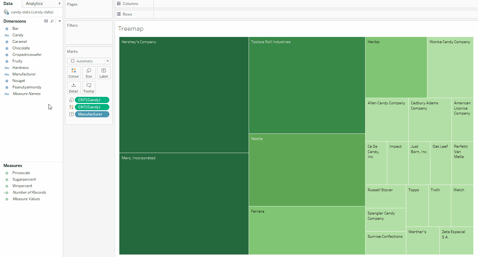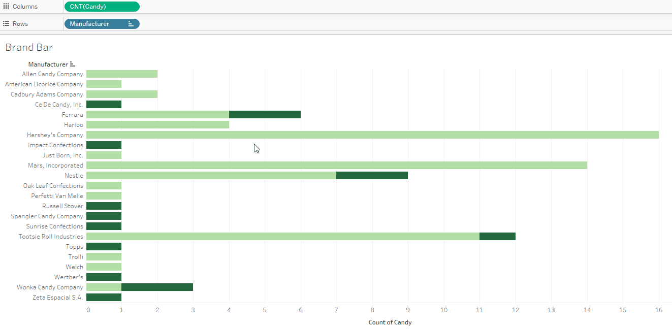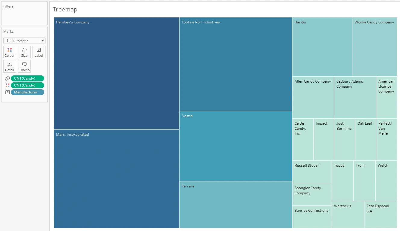 The difference in the size of each box according to count is what makes your treemap, well, a treemap! If you look at your new chart, for instance, you’ll see that the Hershey’s Company has the largest and darkest box. The Marks card shows that CNT(Candy) drives the size and color of the chart. This means that Hershey’s has the most candies. Following behind are Mars and Tootsie Roll Industries, which are both slightly smaller and lighter than the Hershey’s box: