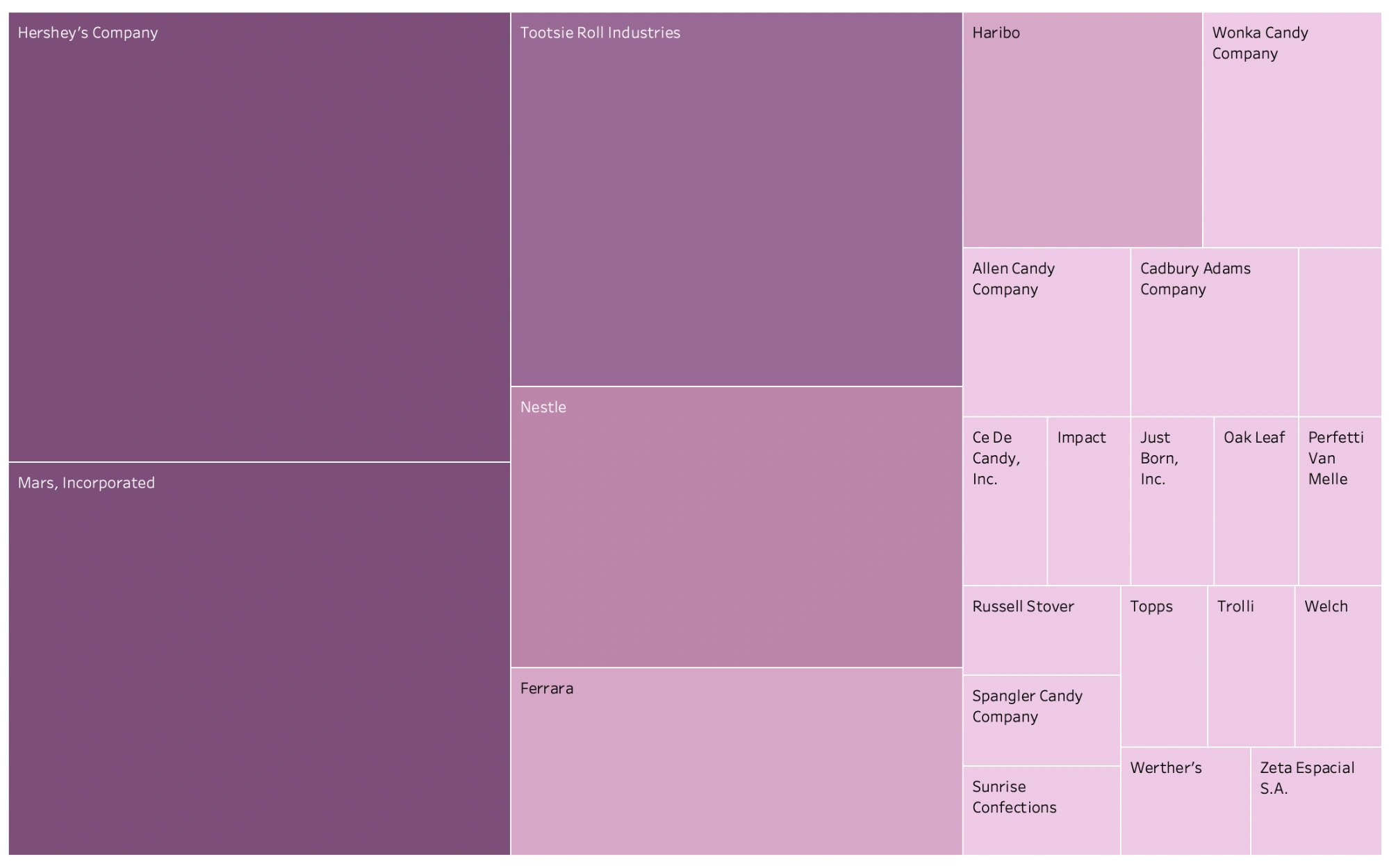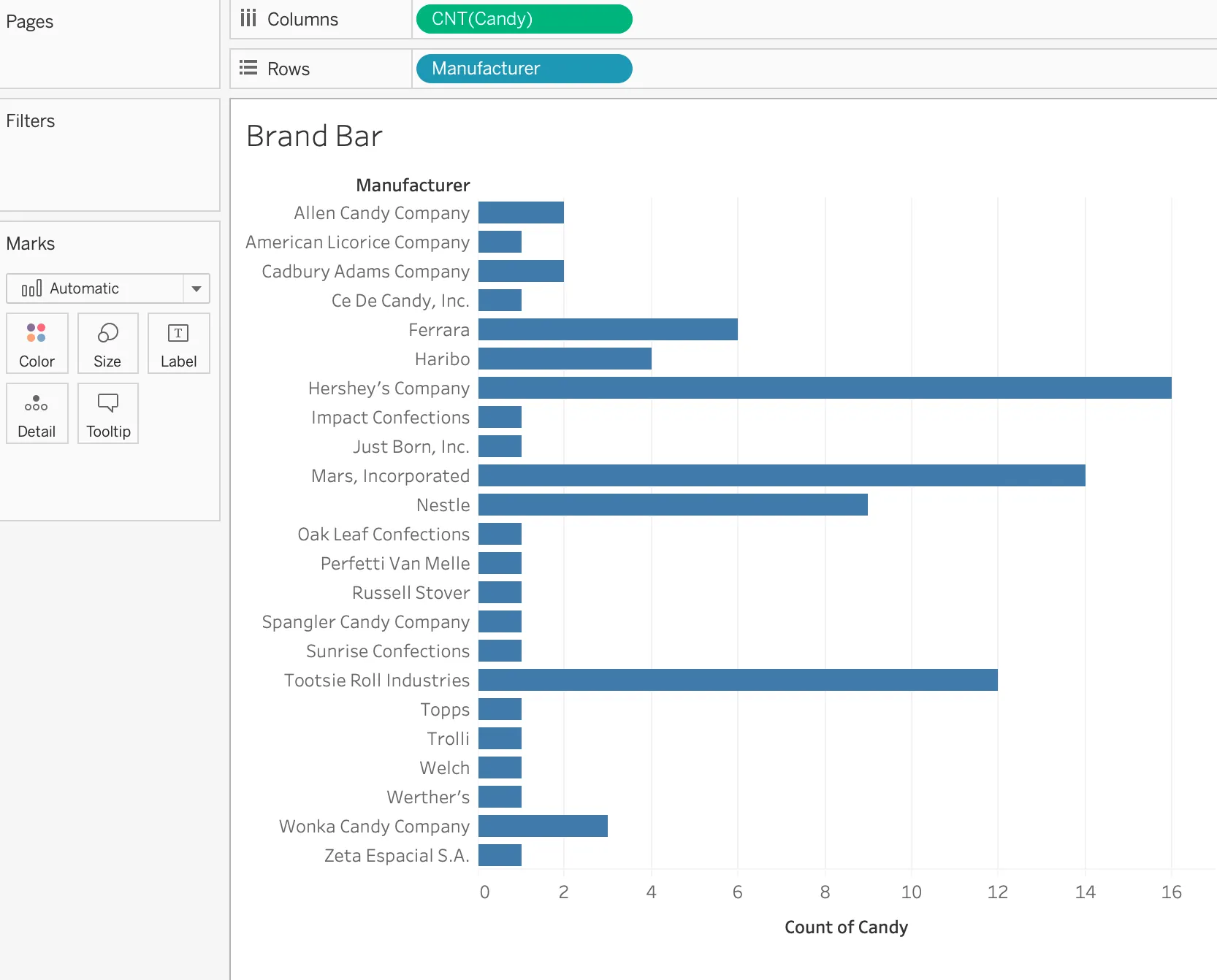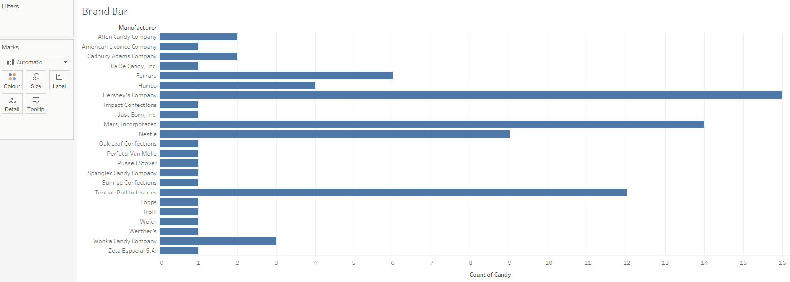 The difference in the size of each box according to count is what makes your treemap, well, a treemap! If you look at your new chart, for instance, you’ll see that the Hershey’s Company has the largest and darkest box. The Marks card shows that CNT(Candy) drives the size and color of the chart. This means that Hershey’s has the most candies. Following behind are Mars and Tootsie Roll Industries, which are both slightly smaller and lighter than the Hershey’s box: