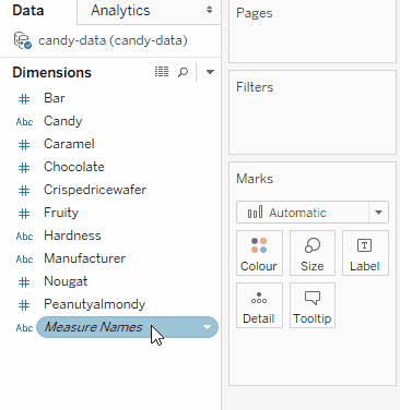 For now, look above the dividing line in the variable menu at the dimensions. Dimensions are qualitative, which means they might hold names, dates, or information about a category. The ones currently displayed are the candy name, the manufacturer name, the hardness level, and Measure Names (don’t worry about this one for now). The dimensions are all blue, which means they’re discrete values. Dimensions can be either discrete or continuous. By default, however, all the variables above the line in Tableau will be blue, and all the ones below the line will be green. You’ll see how to change this later on.