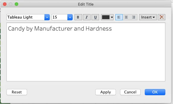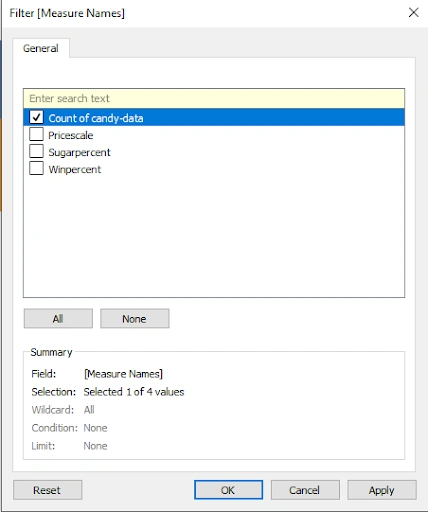 There are two ways to fix this. First, you can click on SUM(Pricescale), SUM(Sugarpercent), and SUM(Winpercent) and press the delete key for each one. Second, remember that Filter box? If you right click on Measure Names and select Edit Filter, you’ll get to that same menu. Now, since you know what variable you want to show, simply uncheck the others and press OK. You should be left with just the total number of hard and soft candies!