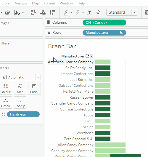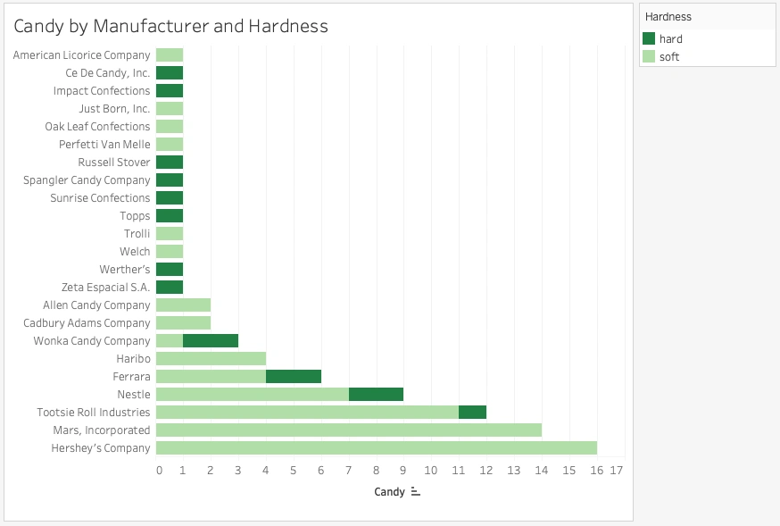 One additional functionality of bar charts is the ability to display two pieces of data on the same chart axis. By default, your first variable will be represented by size (i.e., the bar length), and your second variable will be represented by color. For example, you could show the count of candies by manufacturer and the hardness of those candies—the size of the column would represent the number of candies, while the color would represent the proportion of hard or soft candies. Go ahead and drag the Hardness variable from the left-hand list onto the Color box on the Marks card. The variable will then appear at the bottom of the Marks card with the color icon beside it: