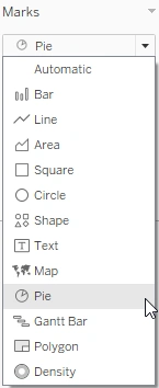 There are multiple ways to make a pie chart in Tableau, but you’re going to use the one that’s most applicable to many types of data. Sometimes, as an analyst, you’ll need to test several different ways to solve a problem! In this case, the first thing you need to do is change the automatic drop down under Marks to Pie. This means Tableau will treat anything you’re trying to create as a pie chart, which makes things much easier! This is like changing the type of chart under the Show Me button.