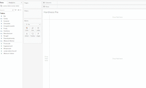 Start by making a new sheet for your visualization by clicking the new sheet icon at the bottom of the Tableau window. Go ahead and call this new sheet something meaningful, like Candy Hardness Pie Chart or Hardness Pie since you’ll be looking at hardness and using a pie chart.