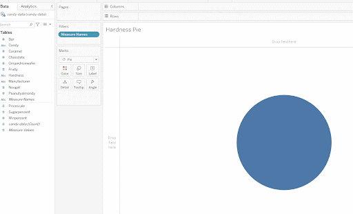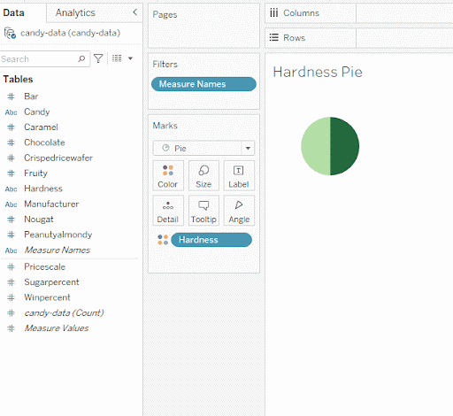 Now that you know a bit more about pie charts in general, let’s take a look at how you can create a pie chart in Tableau! You’ll start by creating a pie chart visualizing candy hardness (one of the dimensions in your data set that you used for your bar chart). Candy is categorized as either “soft” or “hard.” With only two categories, this makes candy hardness a good contender for a pie chart. However, data isn’t always this cooperative. Sometimes, you’ll need to make an extra column or variable and aggregate your data to create a good pie chart element.