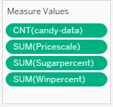 Tableau defaults to showing you the level of detail in your data so that each individual candy (or individual data row) is a new column. To make the bar chart, you want to count the number of candies in each category, and to do that, you’ll need to temporarily turn your Candy variable into a measure. Click on the down arrow to the right of the Candy variable, select Measure from the dropdown list, then choose Count: