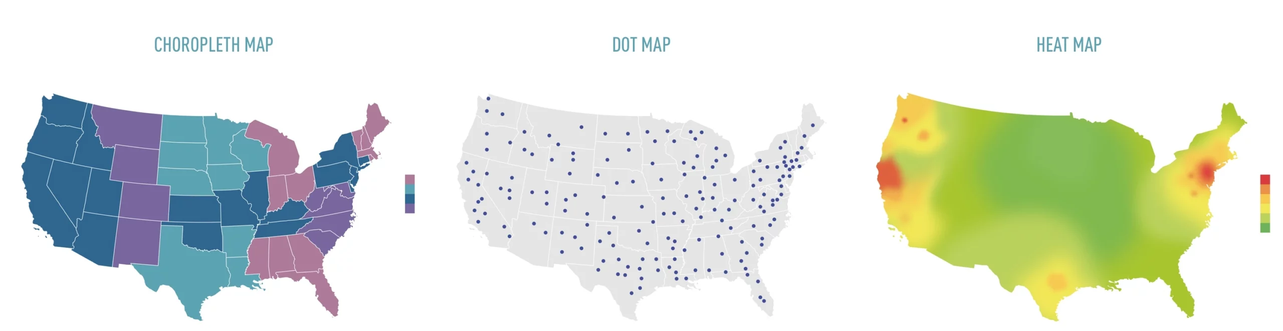 You probably know geospatial charts by their more commonly used name — maps. Maps are used for more than just navigation and are an excellent way to perform spatial analysis (i.e., comparing something across regions). For this purpose, there are choropleth maps, dot (or distribution) maps, and heat maps, each of which can be used for different purposes: