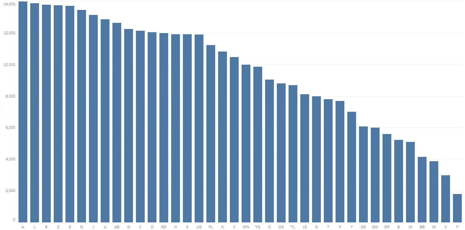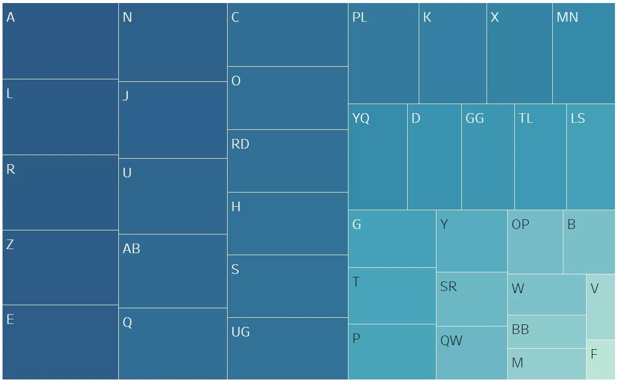 Check out Figure 42, which demonstrates a typical tree map. The size of each box within the chart relates to the count of a single item. The larger the box, the more values there are in that category. Groups A, L, R, Z, and E, for instance, are the largest groups. Here, shading has also been used to supplement the size of the groups, so these boxes are also the darkest boxes in the chart: