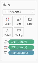 Similar to the pie chart, when you counted the Candy variable, your variables moved from the Columns and Rows shelves to the Marks card. Here, you can see that the CNT(Candy) variable (the count of candy) determines the sizes and colors in the chart, while the Manufacturer variable determines the labels in the chart: