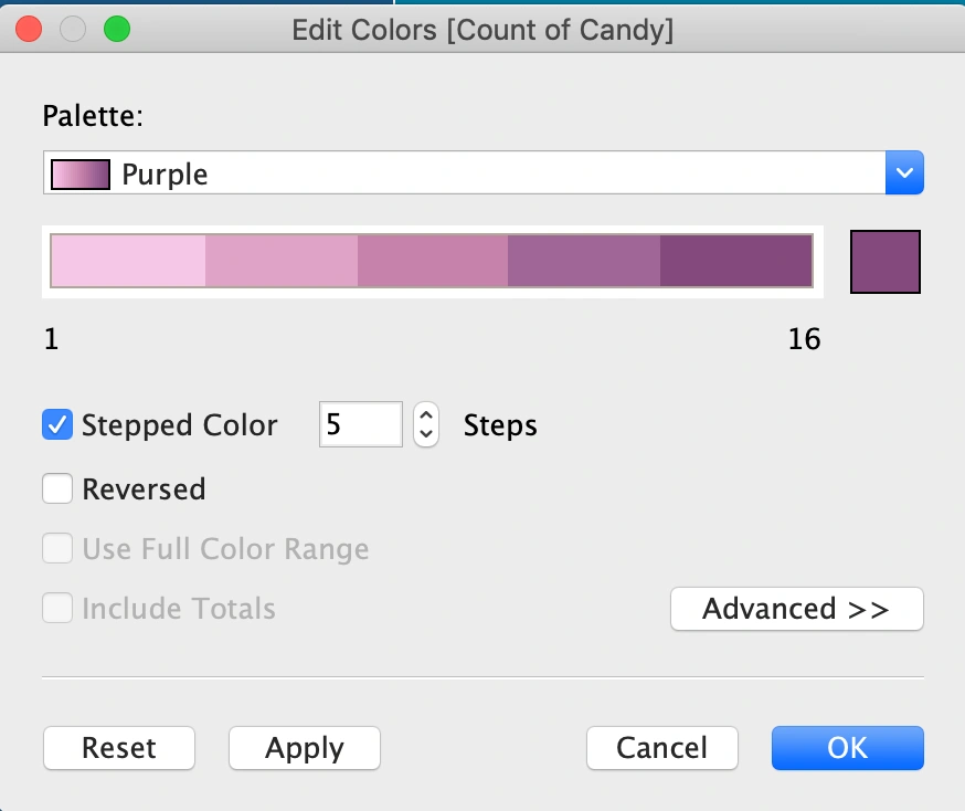 You’ll notice that once clicking Count for the Candy variable, it will change from blue to green, indicating that it’s changed from discrete to continuous.