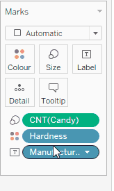Next, drag the data you want to compare into the Color box on the Marks card. In this scenario, this means the Hardness variable, as you want to compare how many candy options are of each hardness: