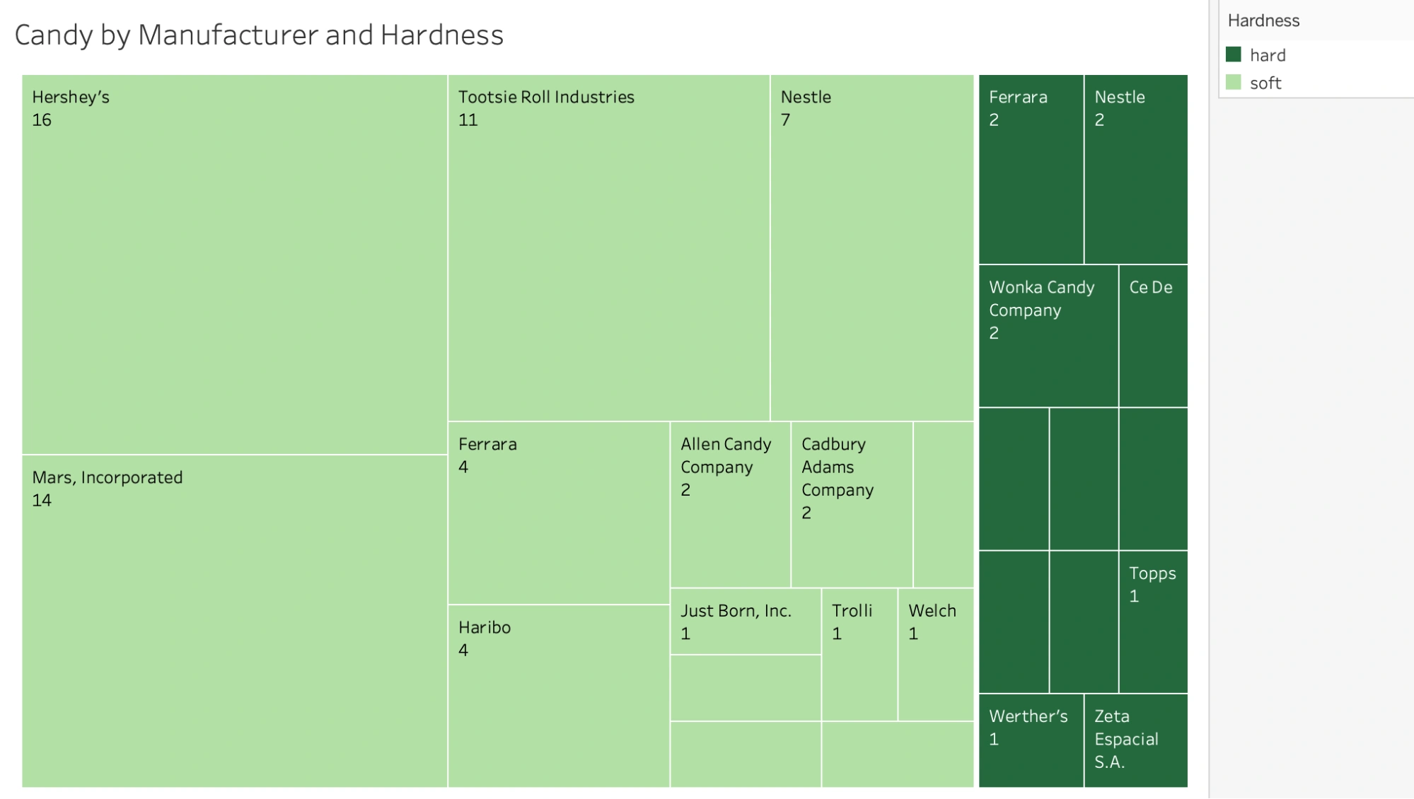 Now, let’s change the title of the chart to be more descriptive—something like “Candy by Manufacturer and Hardness” would work well. Also be sure that you’re displaying the color legend! Once you’ve applied all of these labels, your treemap should look something like this: