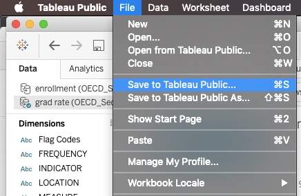 In order to “save” (or “publish”) your visualizations in Tableau Public, open the File menu, then choose Save to Tableau Public: