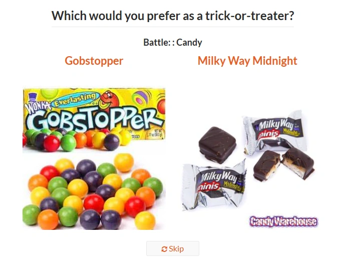 The candy types themselves come with descriptive variables indicating their contents—such as whether they contain chocolate or caramel — as well as variables representing sugar content, relative price, and manufacturing company.