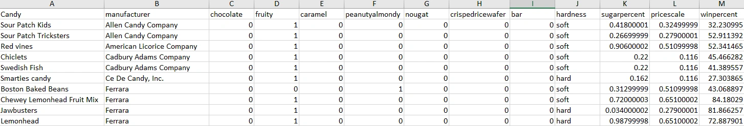 Notice that some of the columns include text (e.g., “manufacturer” and “hardness”), others contain continuous numbers (e.g, “sugarpercent,” “pricescale,” and “winpercent.”), and the rest only include 1s and 0s (e.g., “chocolate,” “fruity,” “caramel,” etc.).This 1s-and-0s nomenclature is commonly used in data sets to represent yes/no or true/false answers. They’re what are known as “indicator variables.” In the chocolate column, for instance, the 1s signify that the candy in question does contain chocolate as an ingredient, while the 0s signify that it doesn’t contain any chocolate. Take a look at some of the 1s in the “chocolate” column to see if you recognize any of the candy names!
