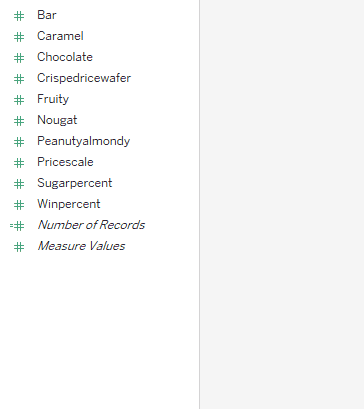 Now that you understand dimensions and measures, as well as continuous and discrete variables, let’s recategorize any variables that have been categorized incorrectly. All the candy characteristic flags (i.e., the 1s and 0s) should be categorized as dimensions. This includes the following variables:
